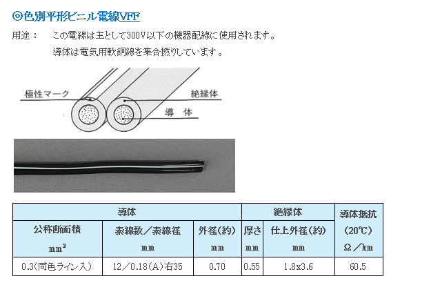 > 色別平形ビニル電線VFF0.3